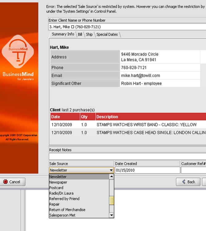 We spend a lot of money on advertising, and it is important for us to know which mediums work. For salespeople, advertising directly affects the money you make. The more effective our advertising is, the more customers are brought in for YOU to sell. To track what advertising is getting us results, the salespeople will select data in the Sales Source field in Business Mind while entering a sales invoice.